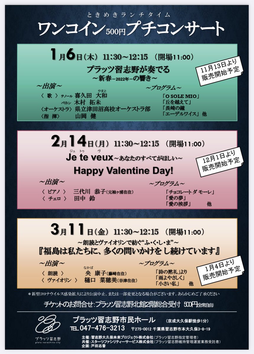 ときめきランチタイム ワンコインプチコンサート 第3回目 〜朗読とヴァイオリンで紡ぐ“ふ・く・し・ま” 福島は私たちに、多くの問いかけを し続けています |